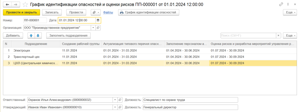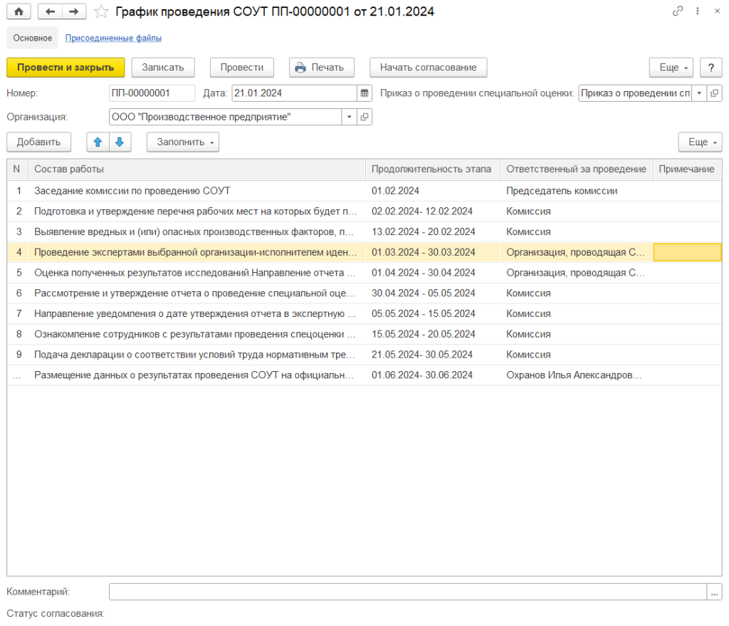 В системе реализована возможность планирования работ по проведению специальной оценки условий труда. Данная возможность доступна с помощью документа График проведения СОУТ. В документе учитывается перечень работ, продолжительность каждой работы, а также ответственные за проведение каждой работы.