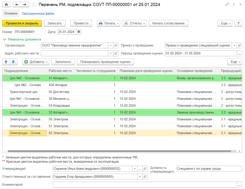 В решении реализована возможность формирования списка рабочих мест, подлежащих оценке, с учетом аналогичных. рабочих мест, для которых определены аналогичные, выделяются в списке цветом. Перечень РМ возможно сформировать как вручную, так и автоматически, на основе ранее введенных данных в систему, позволяющих определить, необходимость проведения очередной оценки.