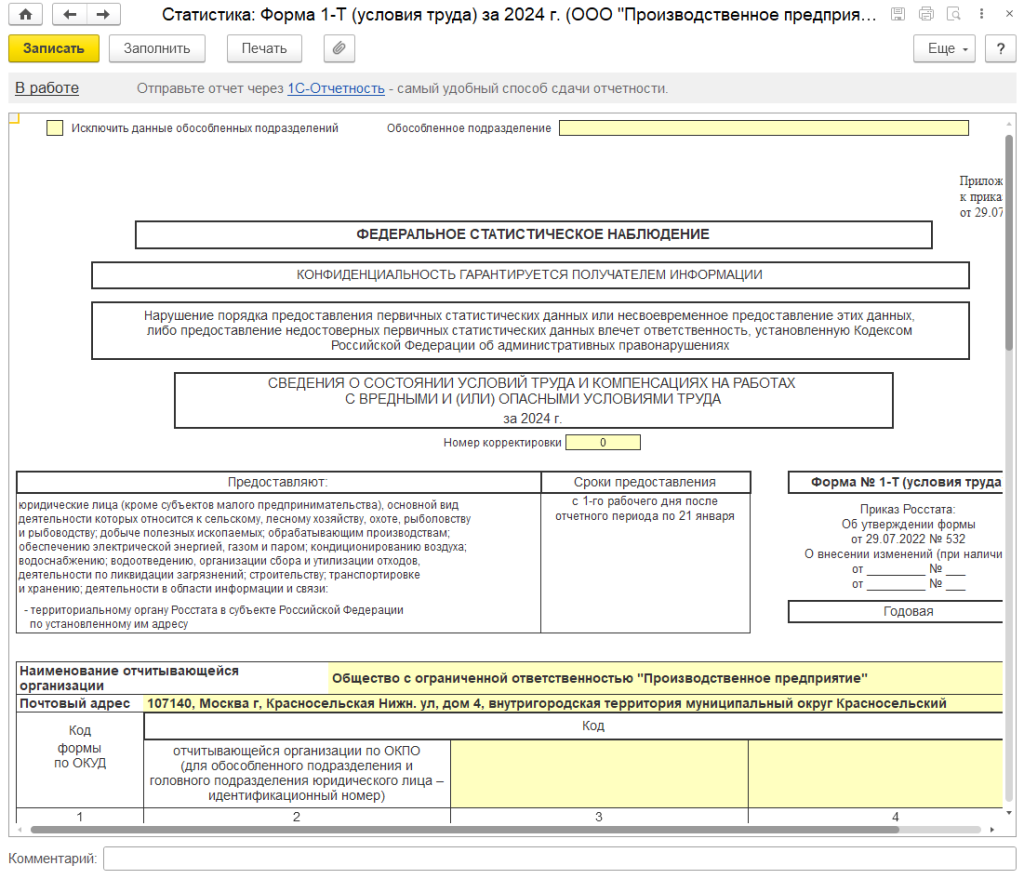 На основе введенных данных система позволяет сформировать отчет 1-Т (условия труда).