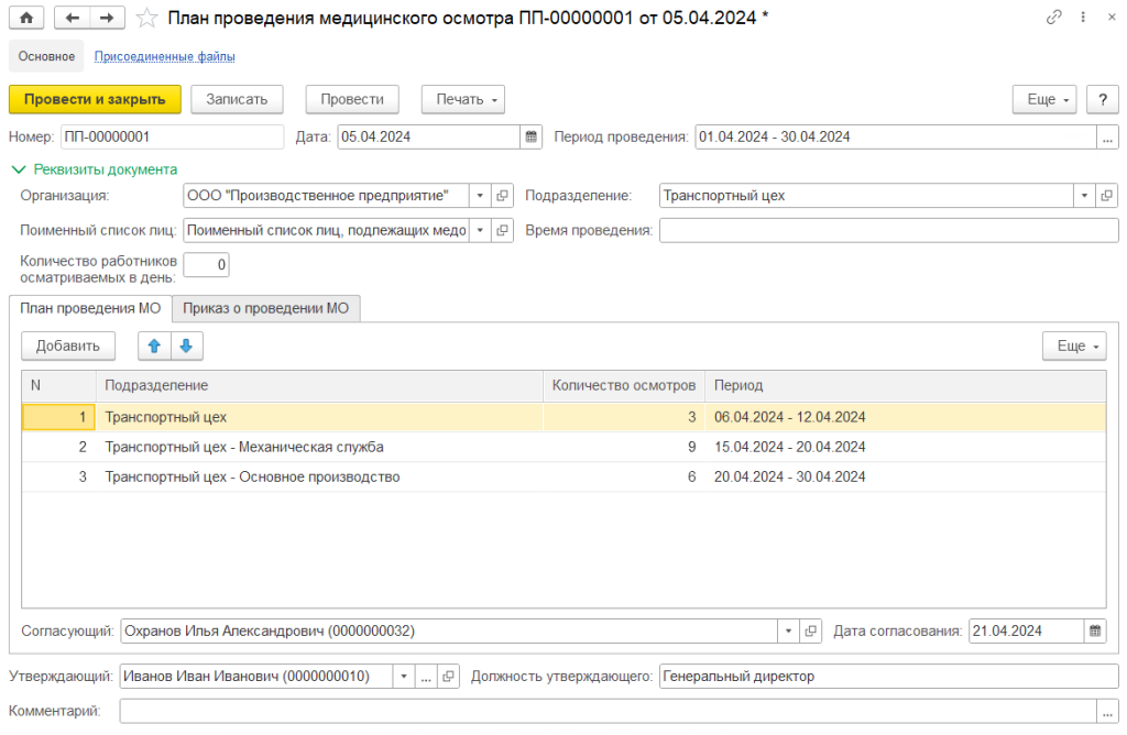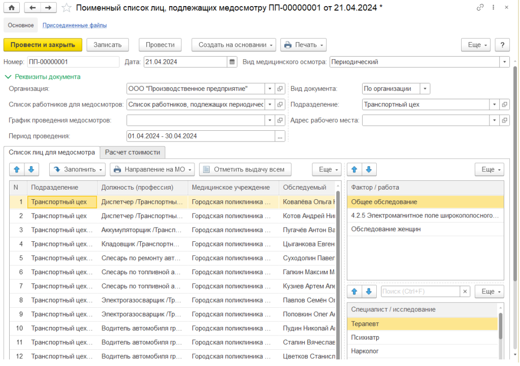 В системе реализована возможность формирования плана проведения медицинских осмотров, документ может быть сформирован как вручную, так и на основании ранее введенного поименного списка лиц, подлежащих медосмотру.