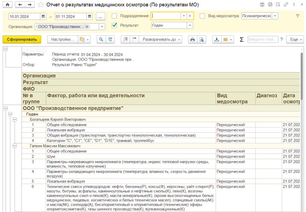 По итогам проведенных медицинских осмотров регистрируются результаты медосмотров сотрудников, а также акты о случаях профессиональных заболеваний.