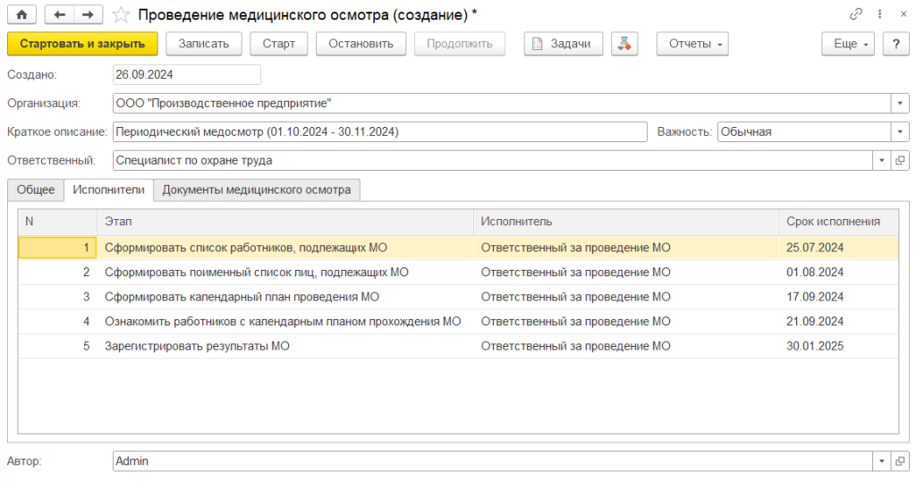 В системе реализована возможность назначать ответственного за каждый этап проведения медицинского осмотра, что позволяет упростить подготовку к проведению медицинского осмотра и оформлению результатов. На каждый этап назначается исполнитель, который отвечает за данный блок. Исполнителю в системе приходит уведомление о том, что он назначен ответственным за проведение одного или нескольких этапов по медицинским осмотрам. Ответственный за блок медицинских осмотров может просматривать состояние процесса в рамках одного окна, что значительно сокращает время на анализ состояния процесса.