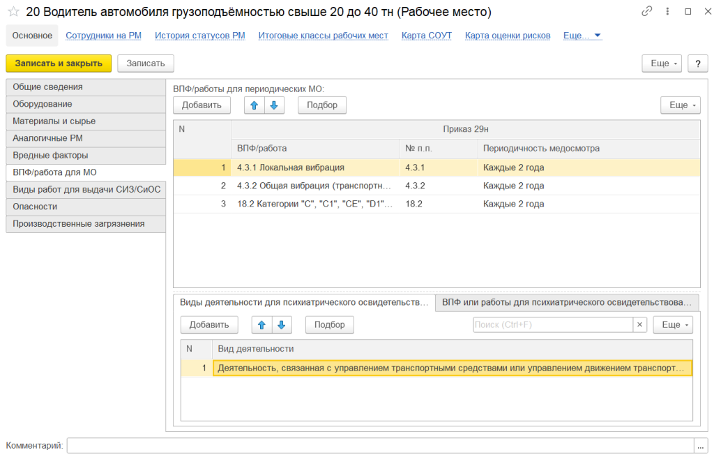 В системе реализована возможность указания на рабочем месте вредных производственных факторов/работ из справочника «Виды деятельности для психиатрического освидетельствования», который поставляется заполненным в соответствии с Приказом Минздрава РФ. На основе этих данных система позволяет автоматизировано заполнять документы по проведению психиатрических освидетельствований.