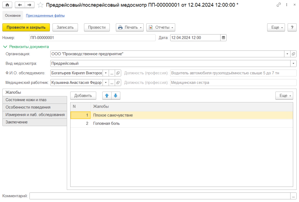 Результаты проведения медицинского осмотра фиксируются в системе документом Предрейсовый/послерейсовый медицинский осмотр.