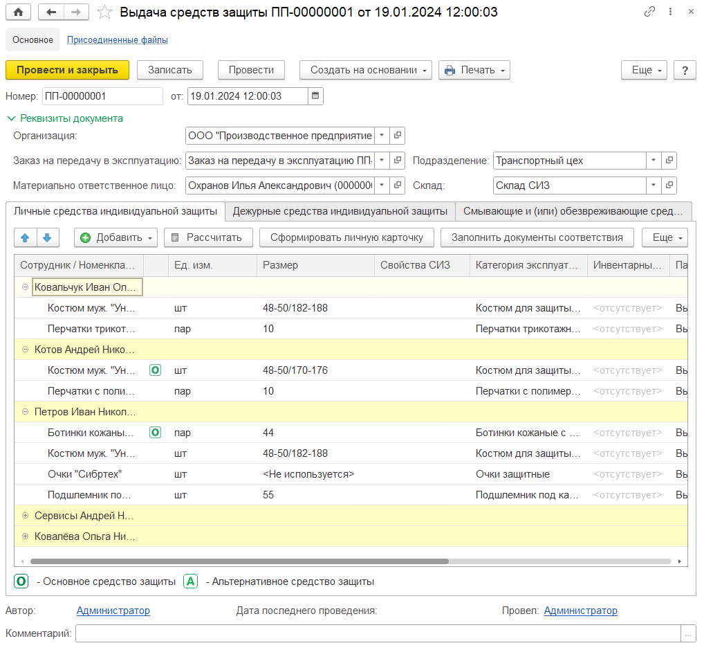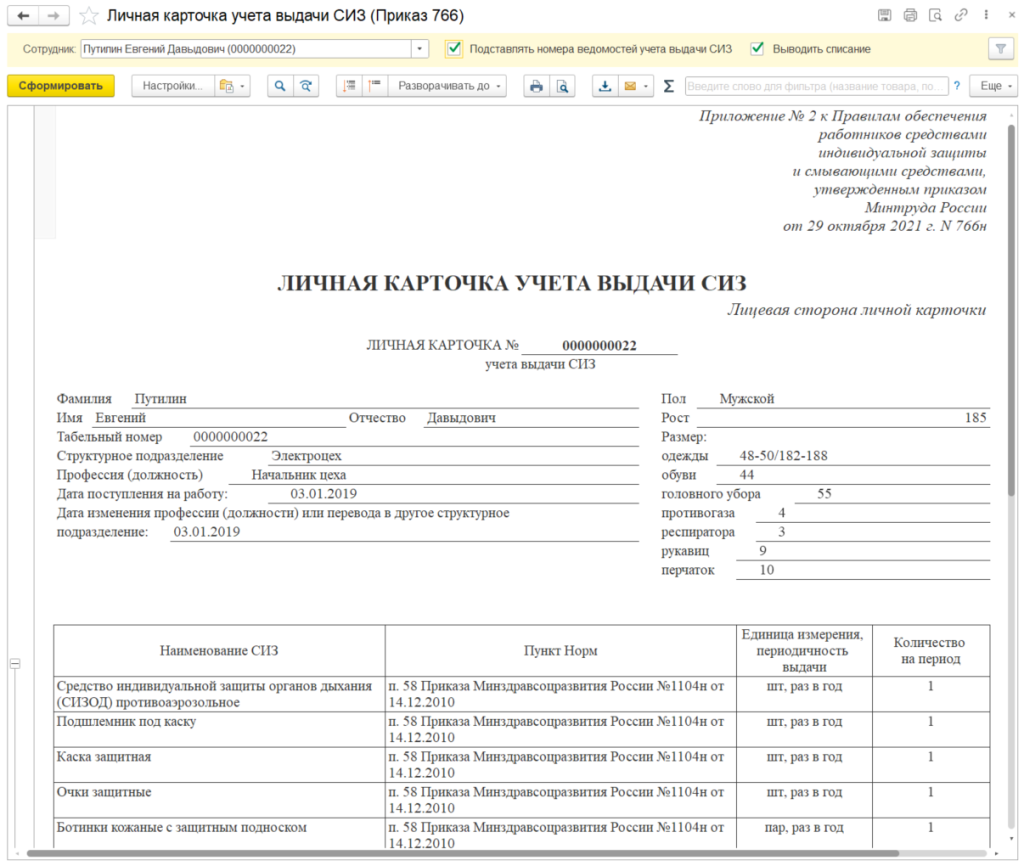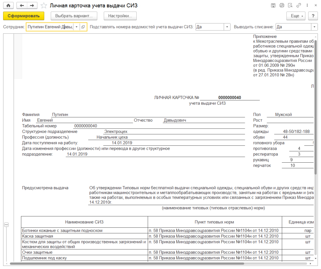 Для каждого сотрудника формируются личные карточки учета выдачи СИЗ и СиОС: