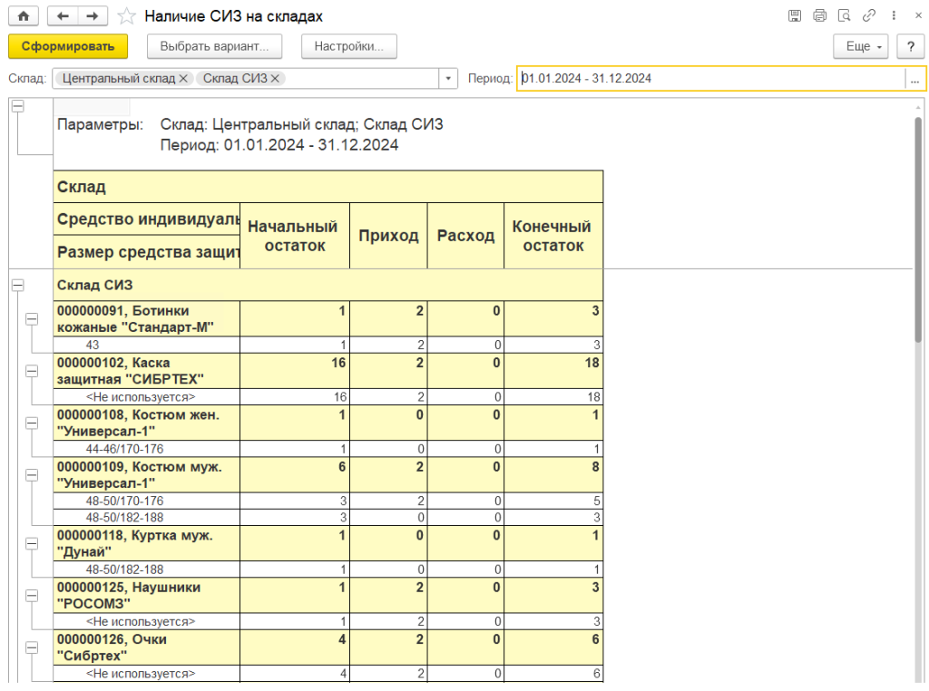 По итогам зарегистрированных перемещений СИЗ и СиОС ведется учет их наличия на складах: