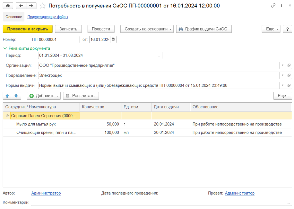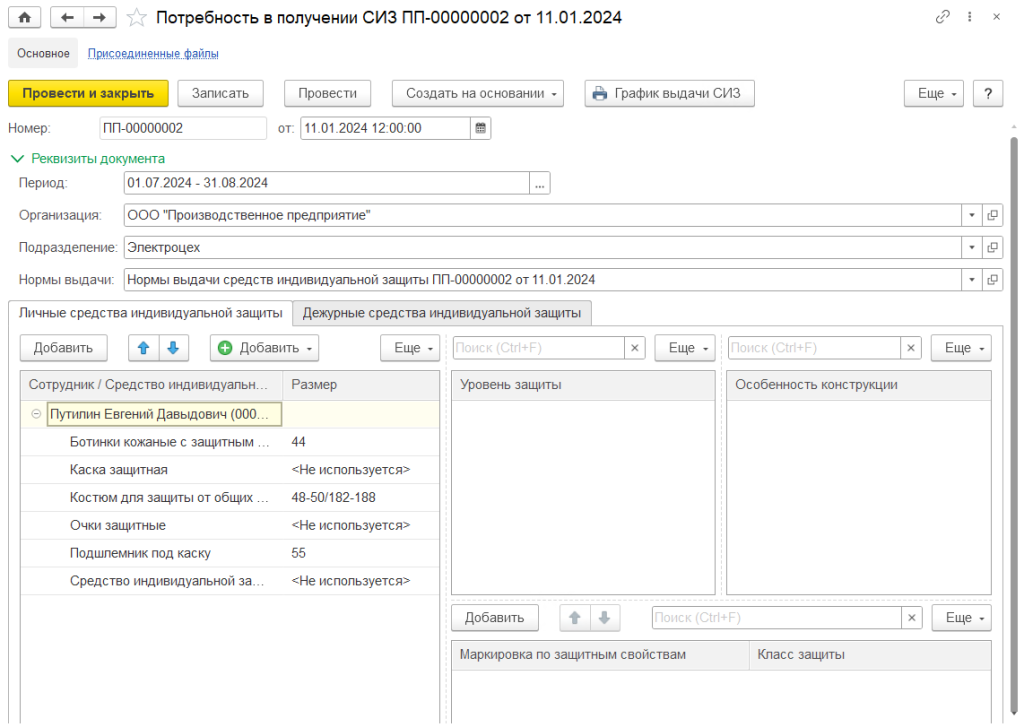 Потребность в получении СИЗ, с возможностью формирования графика выдачи спецодежды, спецобуви и предохранительных приспособлений: