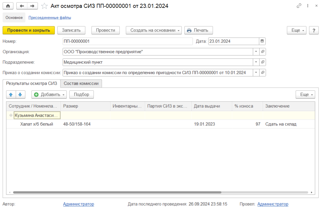 Система позволяет вести учет оценки пригодности СИЗ к дальнейшему использованию. Для этой цели реализованы следующие документы: