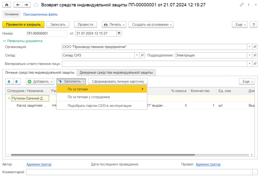 В документе «Возврат средств индивидуальной защиты» реализован автоматический расчет необходимости возврата средств индивидуальной защиты на склад по истечении срока носки: