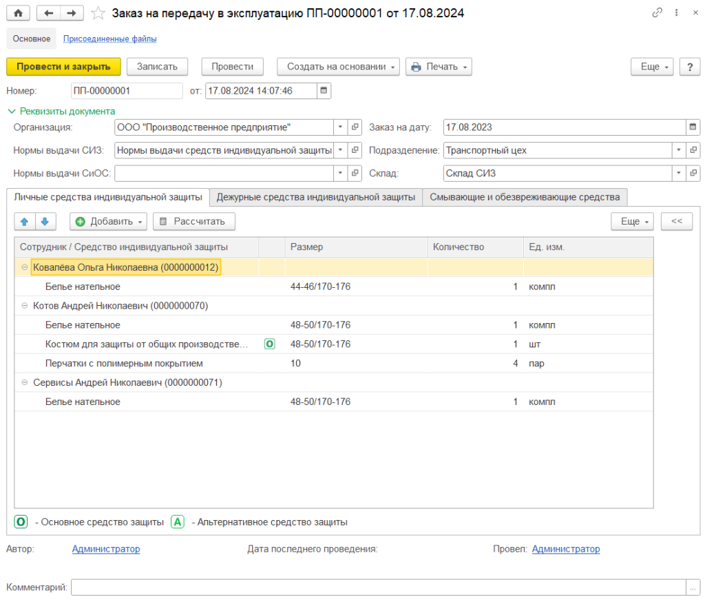 Программный продукт позволяет формировать заказы на передачу в эксплуатацию СИЗ: