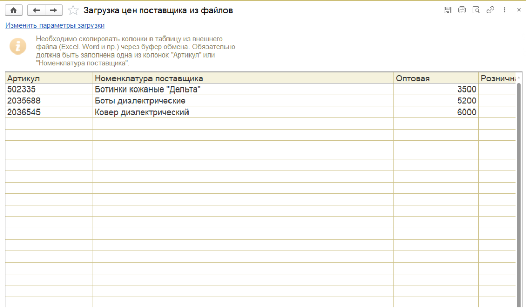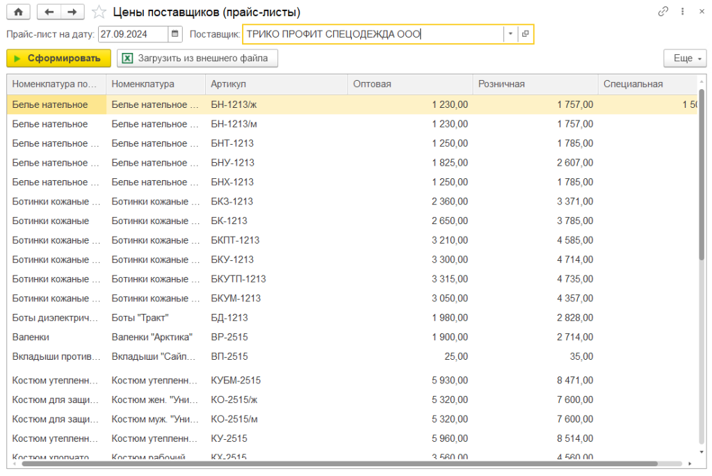 Для загрузки цен из внешнего источника предусмотрена кнопка «Загрузить из внешнего файла». Ознакомиться с актуальными ценами поставщиков, загруженными из внешнего файла, на указанную дату можно нажав кнопку «Сформировать».