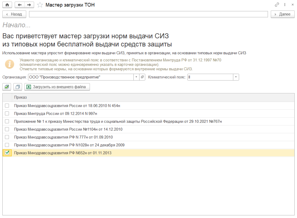 Система позволяет загружать сведения об установленных нормах выдачи на предприятии несколькими способами: загрузкой из внешнего файла либо загрузкой типовых отраслевых норм через Мастер загрузки ТОН.