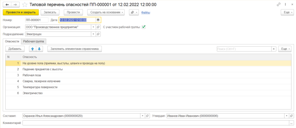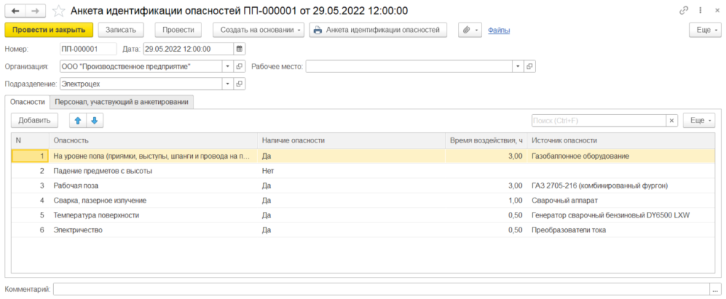 На основании типового перечня опасностей формируется анкета идентификации опасностей с указанием опасностей, времени воздействия, источника опасностей.