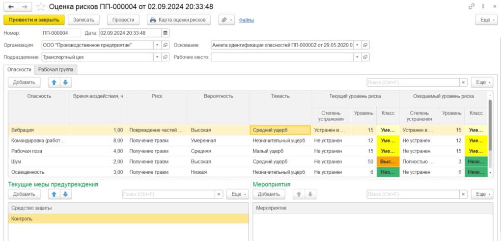 Подсистема позволяет осуществлять идентификацию опасностей и оценивать риски, управлять рисками с помощью проведения соответствующих мероприятий, стремясь к их минимизации. Риск может быть оценен для всей организации, ее подразделений или конкретного рабочего места. Можно гибко настраивать матрицу рисков под локальную методику предприятия. Идентификация опасностей при обследовании на рабочих местах осуществляется с помощью графика идентификации опасностей и оценки рисков.