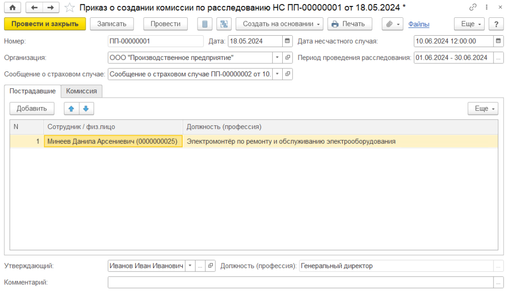 Система позволяет подготовить перечень документов, формируемых организацией при расследовании несчастного случая на производстве.
