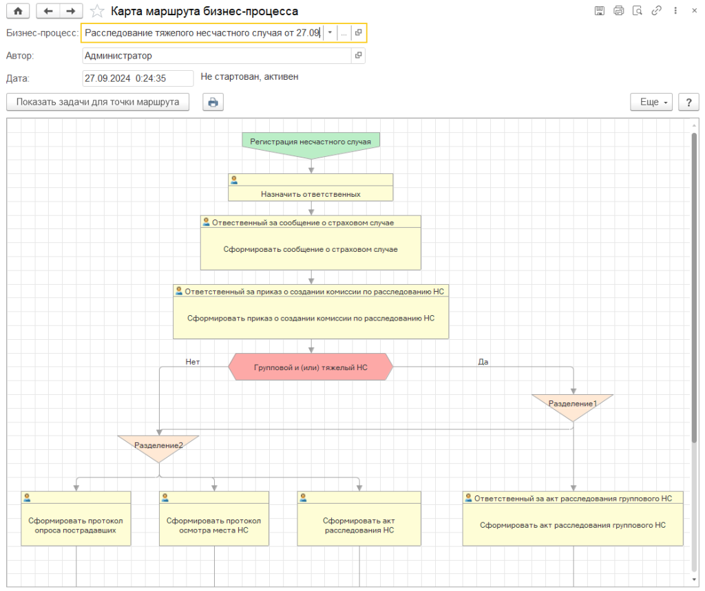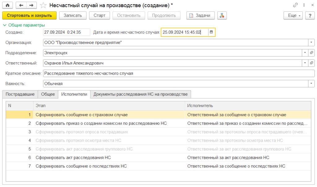 Для повышения контроля выполнения поставленных задач важен процессный подход, который позволяет четко распределить задачи по ответственным. Проведение расследования несчастного случая можно разделить на несколько этапов. На каждый этап назначается исполнитель (пользователь или роль), который отвечает за данный блок. Исполнителю в системе приходит уведомление о том, что он назначен ответственным за выполнение одного или нескольких этапов по несчастным случаям. В зависимости от вида несчастного случая, может отличаться состав этапов.
