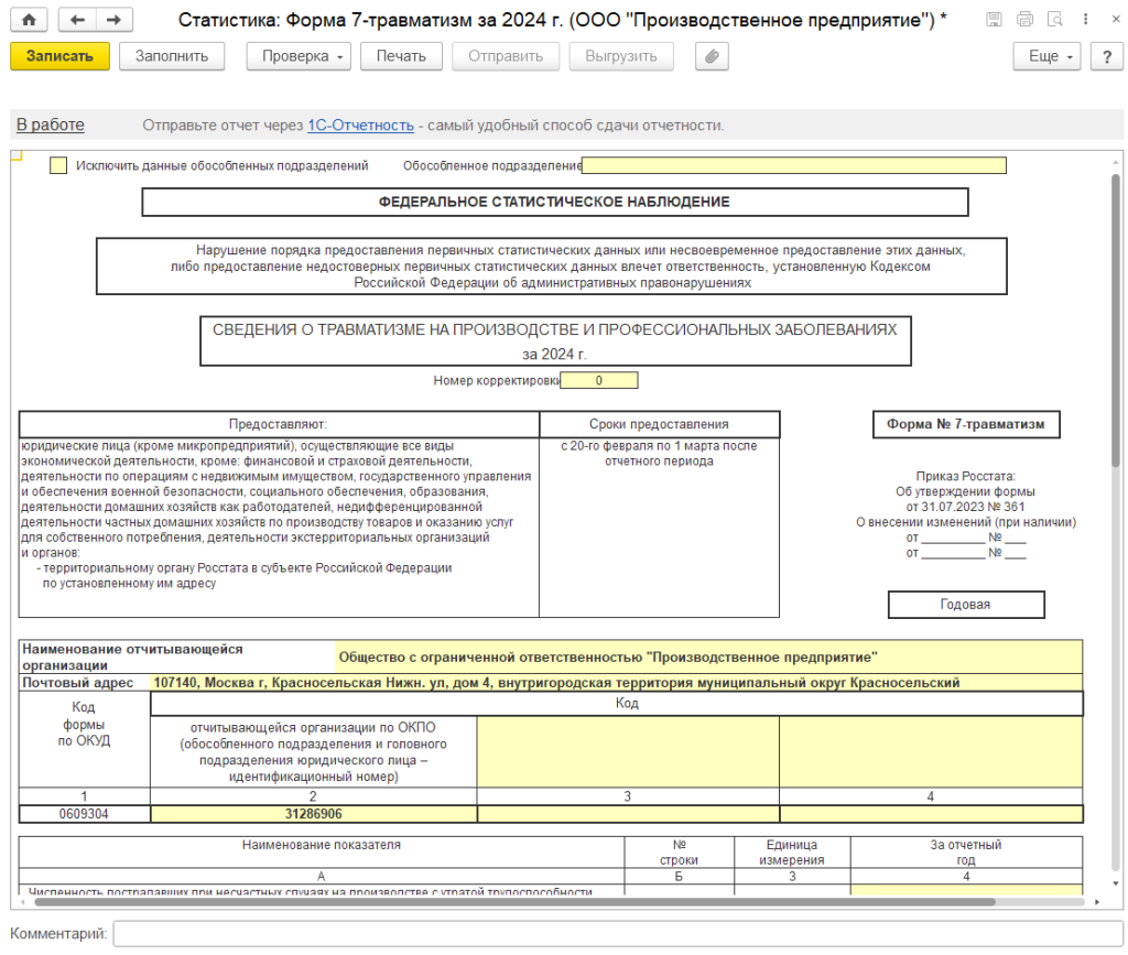 На основе введенных данных система позволяет сформировать отчет Форма № 7-травматизм: