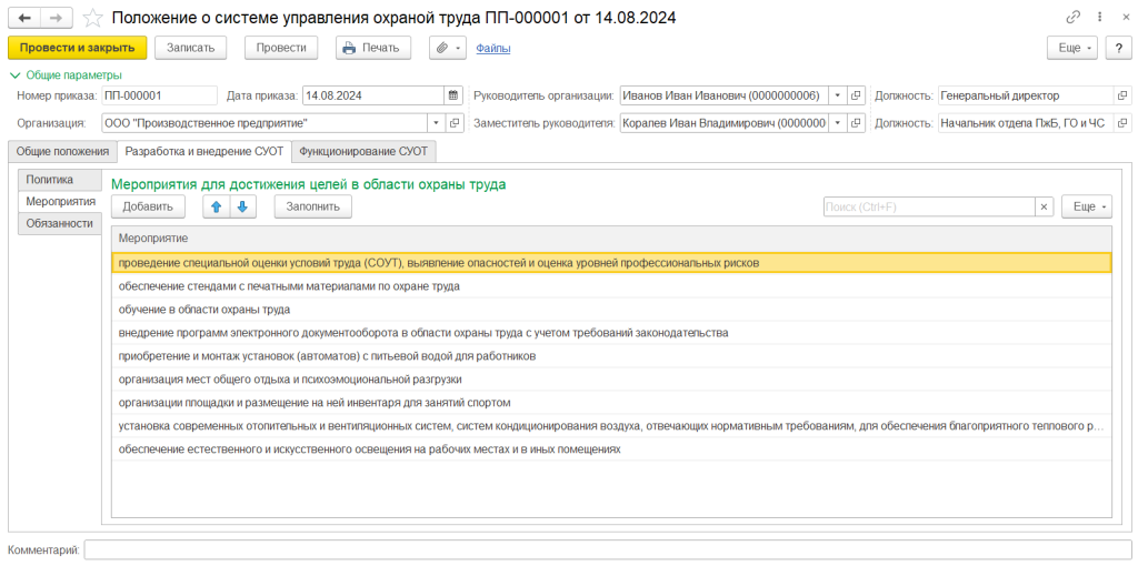В системе реализована возможность интерактивного формирования Положения о системе управления охраной труда, в соответствии с рекомендациями Приказа Минтруда России «Об утверждении Примерного положения о системе управления охраной труда».