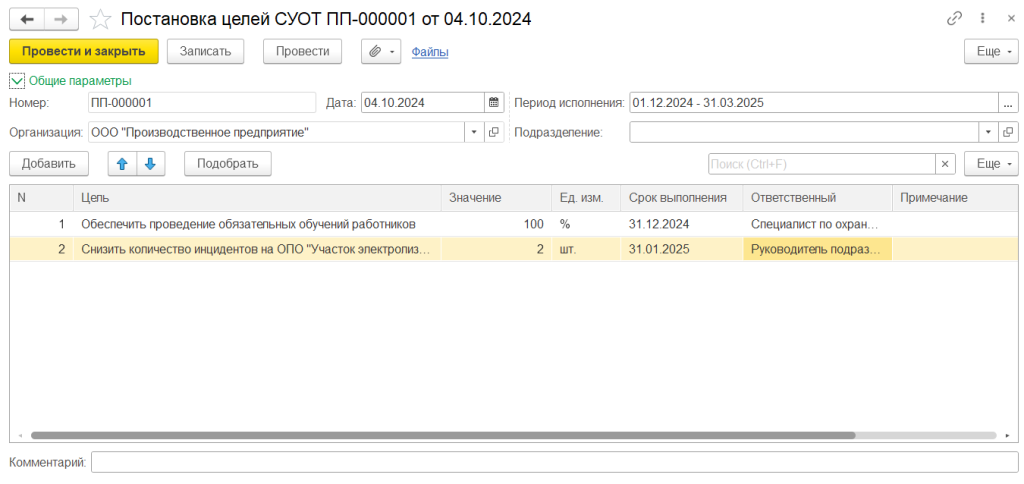 Система позволяет устанавливать цели в области охраны труда для достижения результатов, согласующихся с политикой по охране труда. По каждой цели устанавливается ее значение, срок выполнения и ответственный.