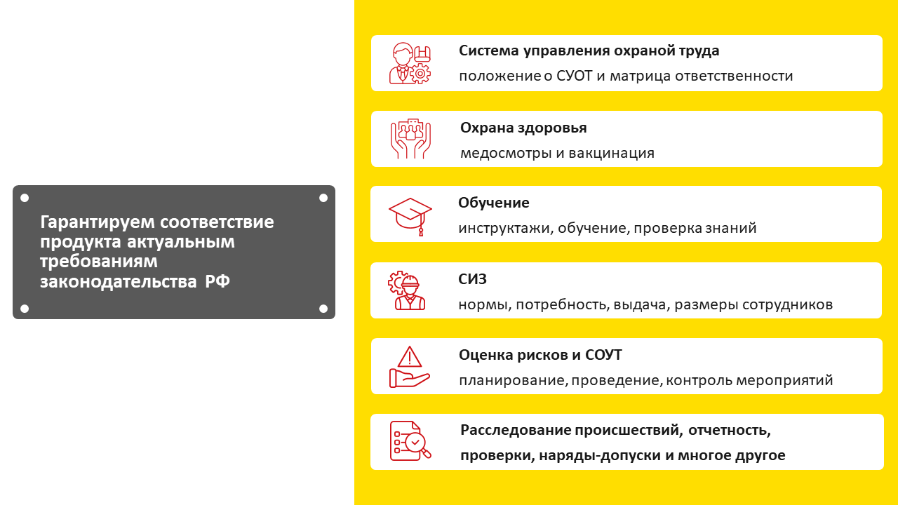 Система предоставляет возможность планирования и контроля выполнения мероприятий по устранению нарушений требований нормативно-технической документации, выявленных в результате расследования несчастных случаев и профзаболеваний, внешних и внутренних проверок состояния охраны труда, охраны окружающей среды, промышленной и пожарной безопасности, а также мероприятий, направленных на предупреждение аналогичных несчастных случаев и профзаболеваний в будущем. В системе реализованы аналитические отчеты для оперативного получения информации о выполнении мероприятий в различных разрезах.