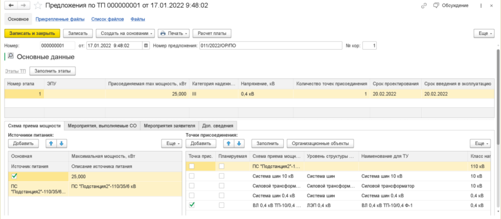 Проверенные заявки на технологическое присоединение переходят на этап подготовки «Предложений по технологическому присоединению». В документе указывается точка присоединения, автоматически определяется источник питания при выборе точки, заносятся мероприятия, выполняемые сетевой организацией и заявителем.