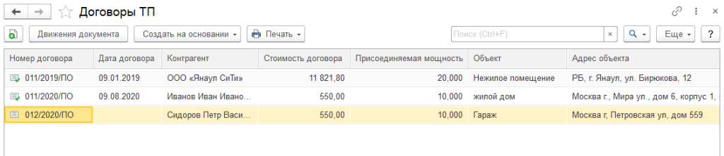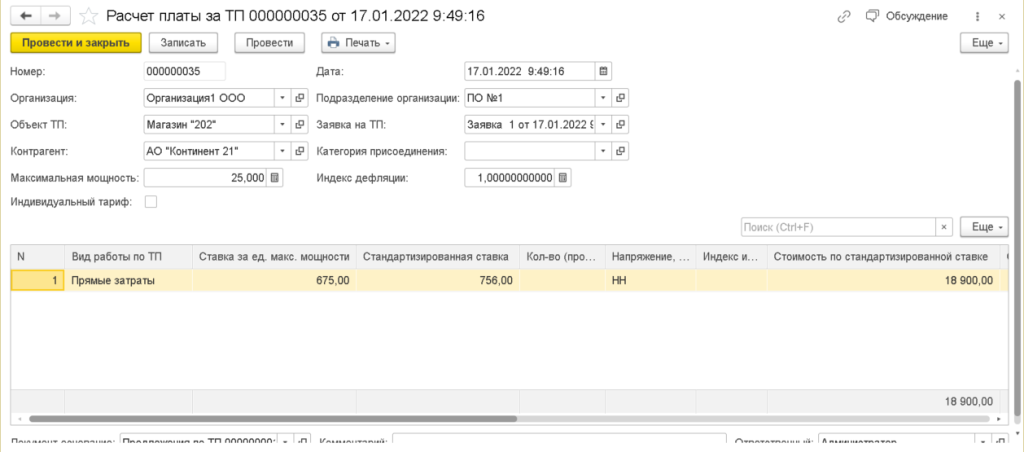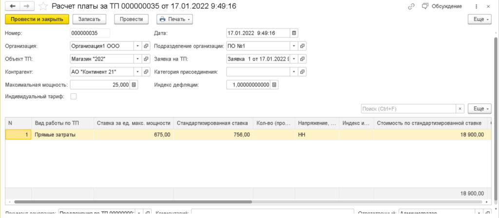 После разработки технических условий, в договоре автоматически заполняются все ранее указанные значения и сумма договора из утвержденного типа тарифа. Подсистема проверяет параметры подключаемого объекта и определяет возможность льготного присоединения, а также автоматически заполняет подписывающих лиц для печатных форм.