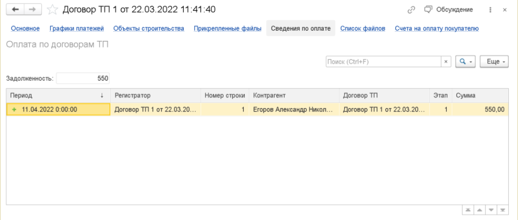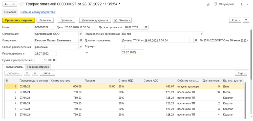По графику платежей регистрируются даты плановой оплаты. Имеется возможность отслеживать платежи по договорам.