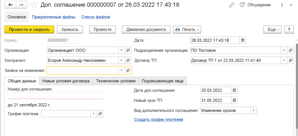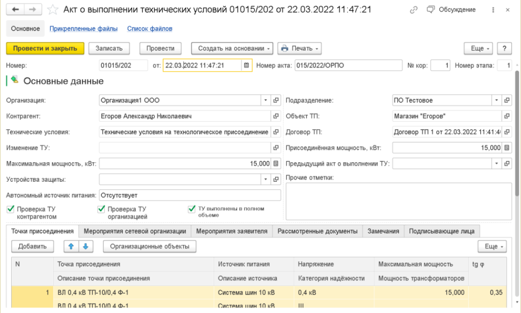 После формирования договора в системе предусмотрен бизнес-процесс «Проверка исполнения технических условий». Формируется «Акт о выполнении ТУ» и «Акт об осуществлении ТП».