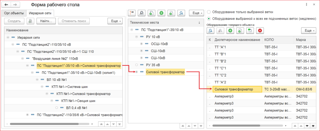 - Ведение организационной структуры подчинения оборудования подразделениям организации и основному оборудованию;