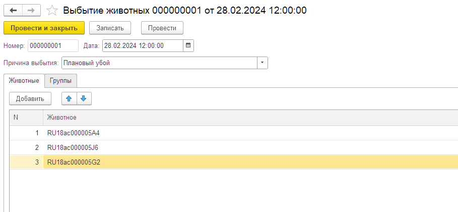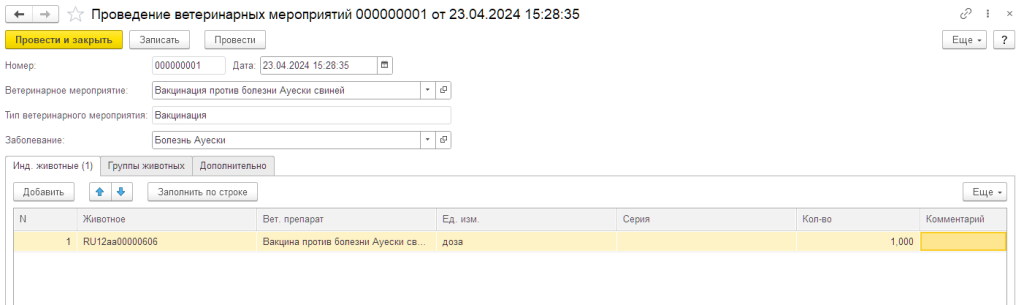 В программе предусмотрена возможность регистрировать ветеринарные мероприятия как индивидуально для по каждому животному, так и по группе животных.
