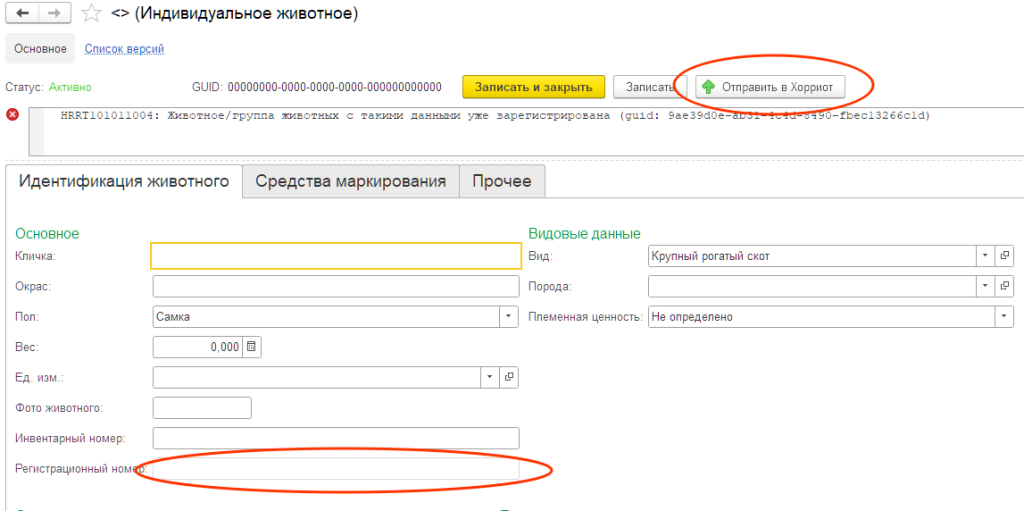 Передача информации о животных ФГИС ВетИС Хорриот для получения регистрационных номеров животных.