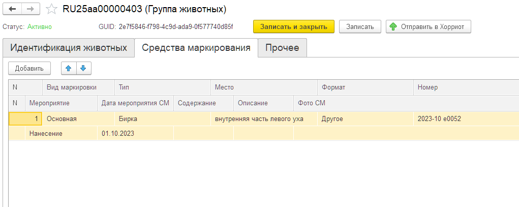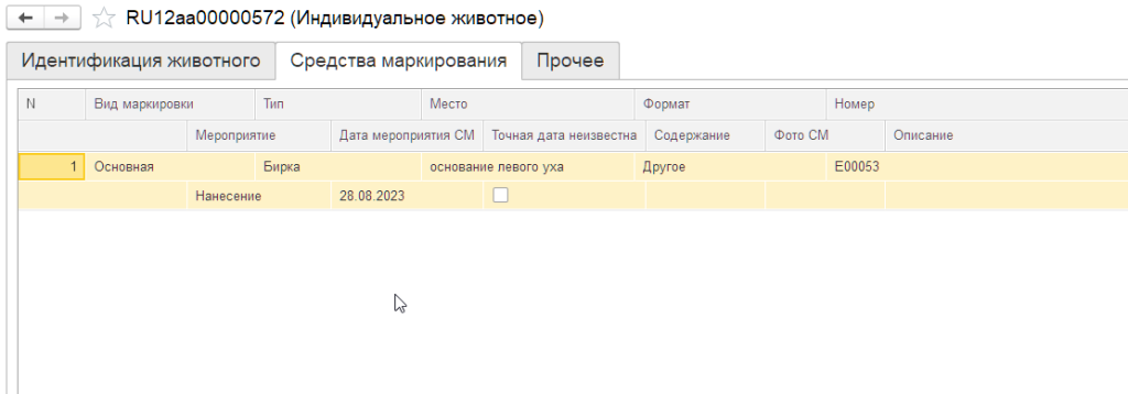 Ведение индивидуального и группового учета животных в соответствии с требованиями Россельхознадзора. Дата маркирования, наименование места маркирования, номер средства маркирования, описание средства маркирования, место закрепления, или введения, или нанесения средства маркирования, сведения о лице (организации), осуществившем маркирование. Просмотр списка животных с фильтрами и группировками по различным реквизитам.