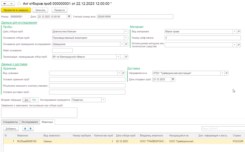 Программой предусмотрена возможность регистрировать акты отбора проб для лабораторных исследований.