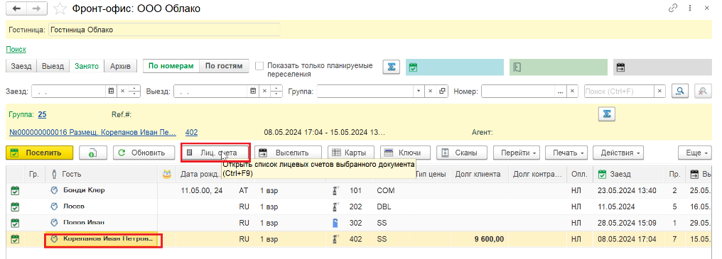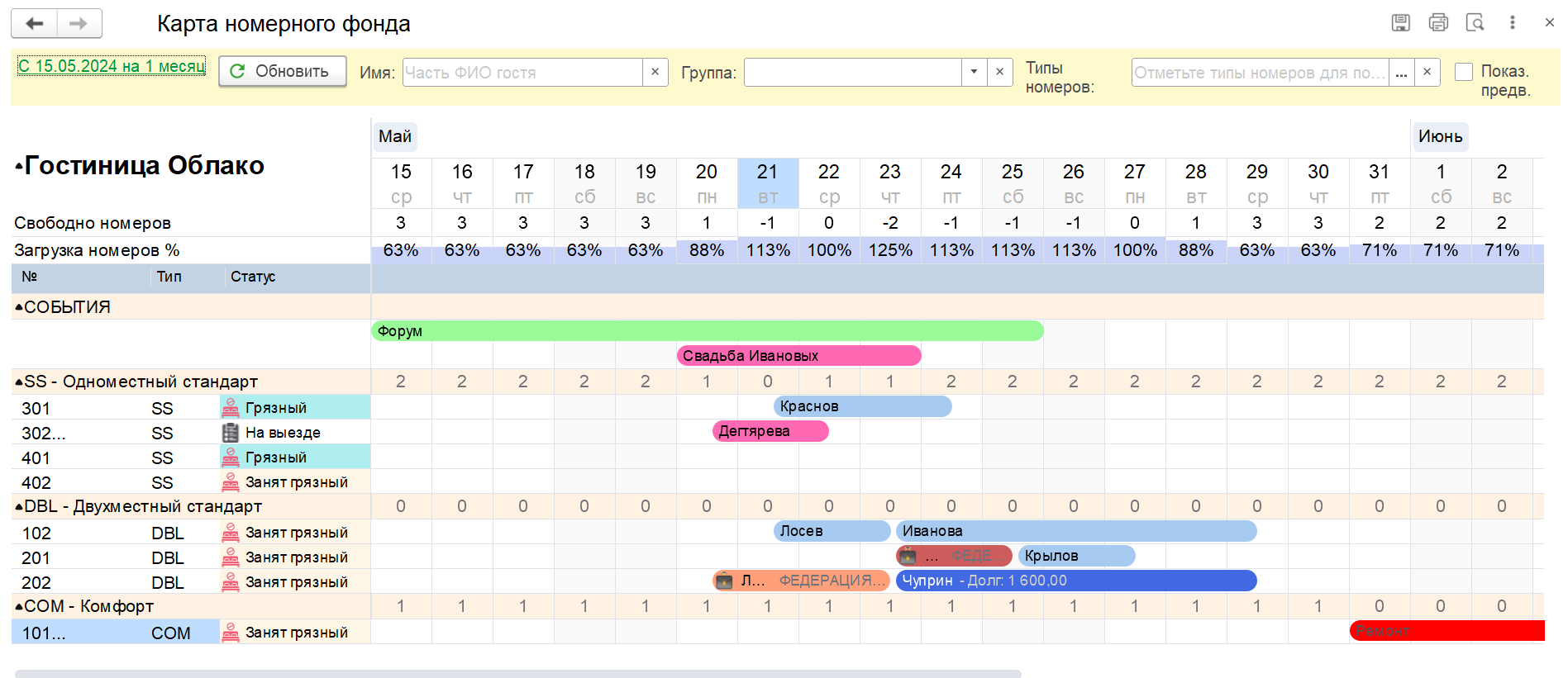 В день заезда гостя статус номера меняется на «занятый, чистый».