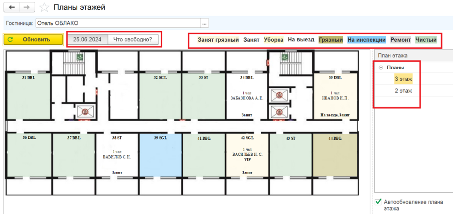 Графический план этажа — альтернативный вариант представления номерного фонда, с указанием расположения номеров на этаже. План этажа позволяет в режиме реального времени отслеживать статусы номеров – занятые, свободные, нуждающиеся в уборке, а также позволяет администраторам отеля быстро и эффективно размещать гостей, учитывая их предпочтения (вид из окна, близость к лифту или наличие балкона).