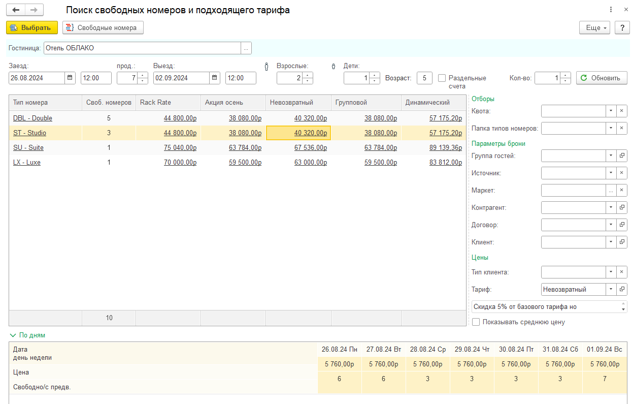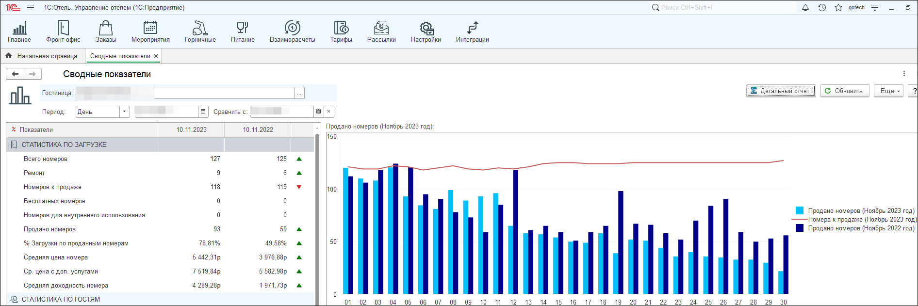 1С:Отель рассчитывает ключевые показатели работы отеля, такие как: выручка на номер (RevPAR), Загрузка, Средняя цена (ADR), средняя продолжительность проживания (ALS), сумма продаж.