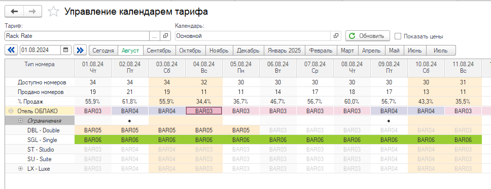 Управление тарифами. Система управления тарифами позволяет реализовать гибкие схемы по продаже гостиничных услуг, а календарь управления уровнем цены и ограничениями по тарифу — вести адаптивную сбалансированную ценовую политику.