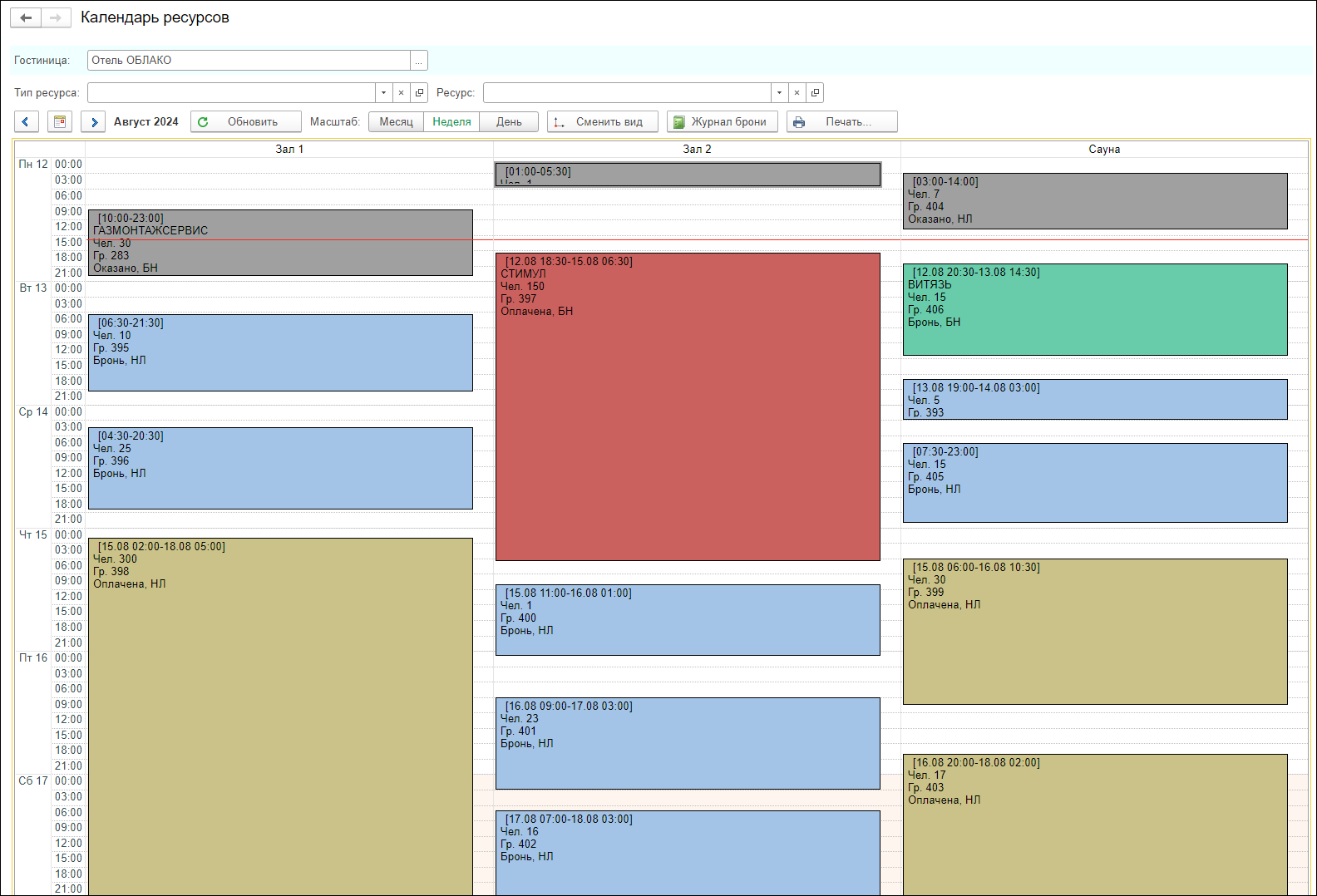 Бронирование ресурсов. Система позволяет осуществлять бронирование ресурсов отеля: банкетных и конференц-залов, комнат переговоров, кабинетов, спортивных помещений, саун, бань и др. Бронирование осуществляется в специальной форме брони ресурса, «1С:Отель» позволяет создавать записи броней, вести журнал записи броней ресурсов, отслеживать актуальную информацию по загрузке в календаре ресурсов, вести взаиморасчеты и контролировать оплату услуг по ресурсам.