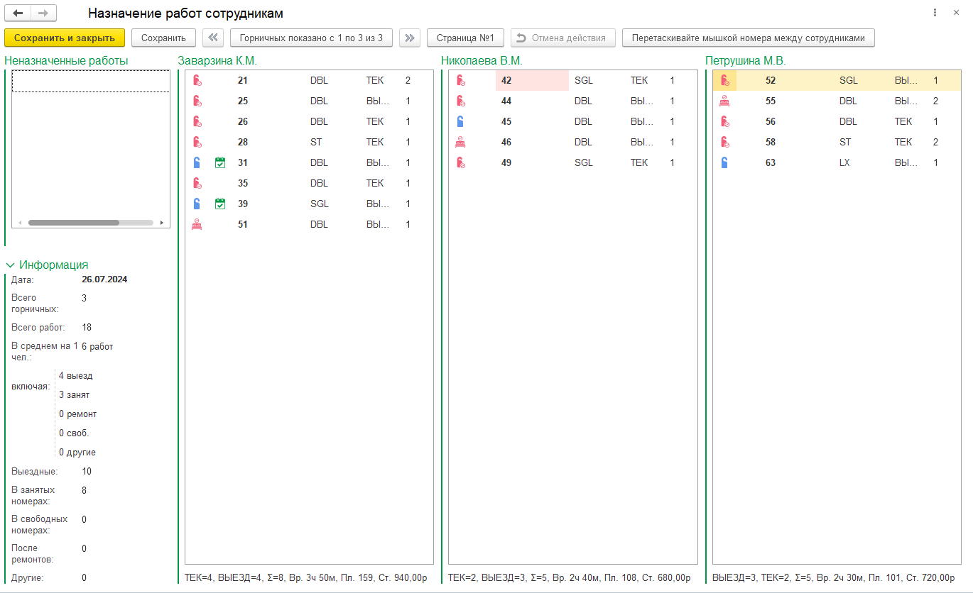 Распределение работ. Специальное рабочее место Супервайзера используется для назначения работы горничным, и печати персонального плана работ на день.