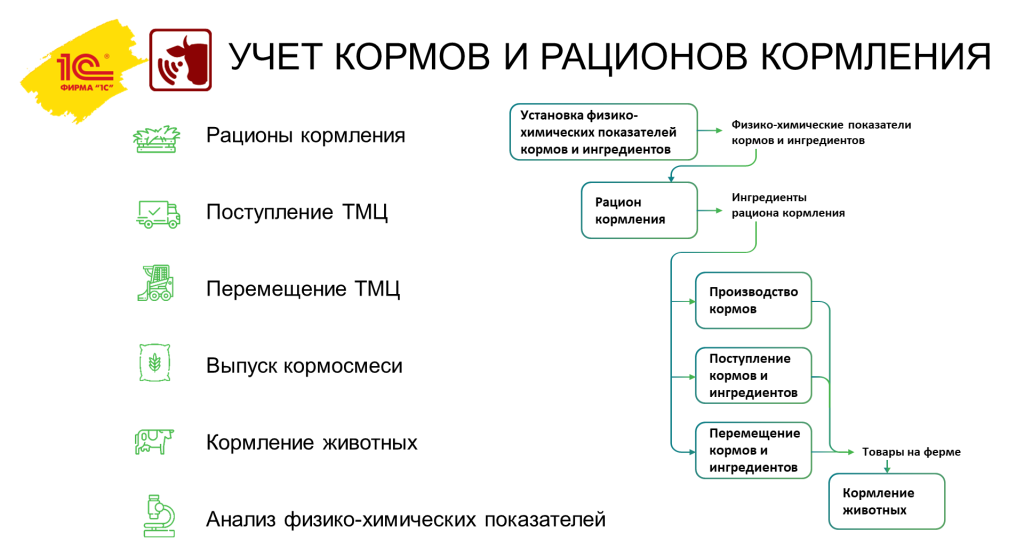 Конфигурация не содержит функции расчета рационов кормления. Подсистема позволяет вести учет рационов кормления животных, отражать движение ингредиентов для приготовления кормов (приход, перемещение, расход), отражать производство кормов и их списание (кормление животных). Система также позволяет учесть суточную потребность животных в корме.