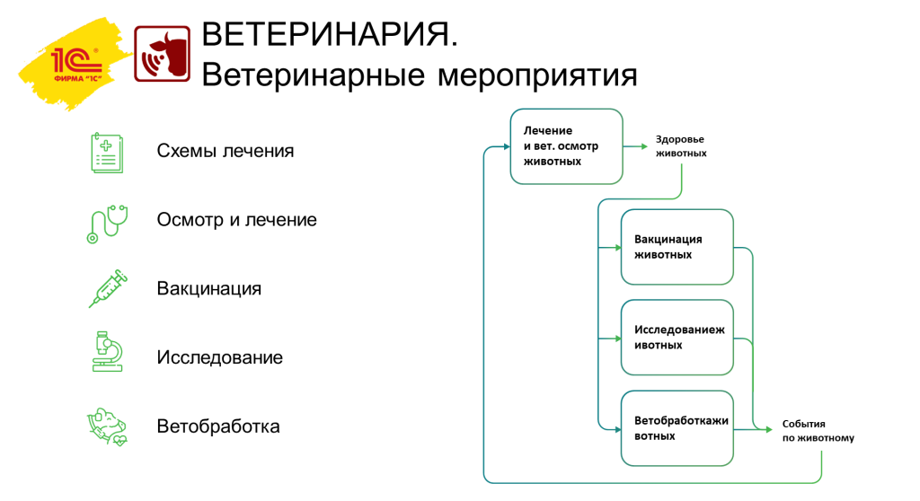 Ветеринарный врач формирует схемы лечения, устанавливает препараты и дозировку. При вводе данных о том или ином событии подсистема позволяет учесть плановый и фактический расход ветеринарных препаратов. Ветеринарные мероприятия делятся на плановые, например: ежегодные вакцинации, и событийные: в результате выявления болезни, после отёлов и т.д. На основе введенной информации ветврач отслеживает здоровье стада, а также ведет статистику по заболеваниям животных.