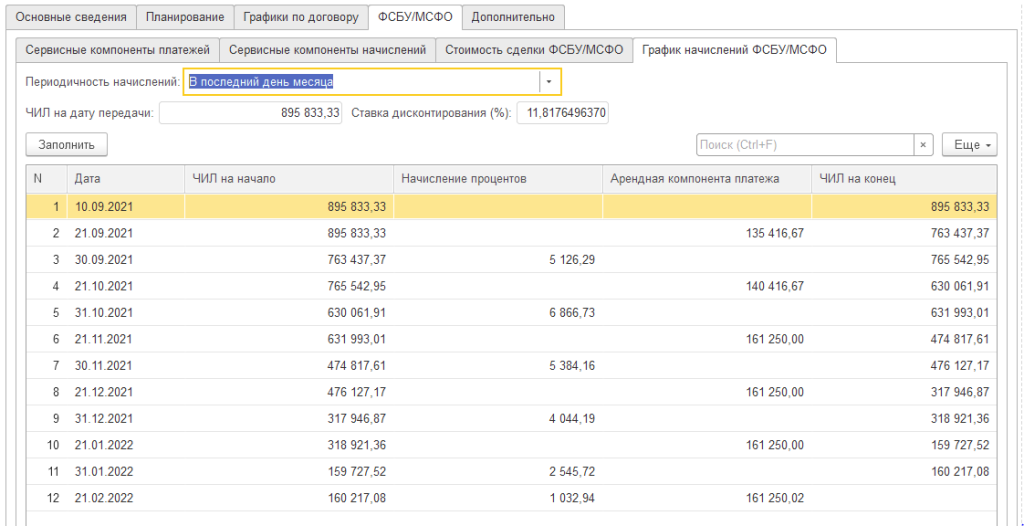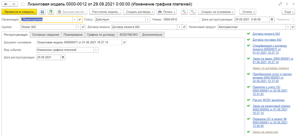 - изменений условий лизинговых договоров и пересчета графиков платежей и начислений с отражением событий, соответствующих изменениям (отражение изменений модели расчета);
