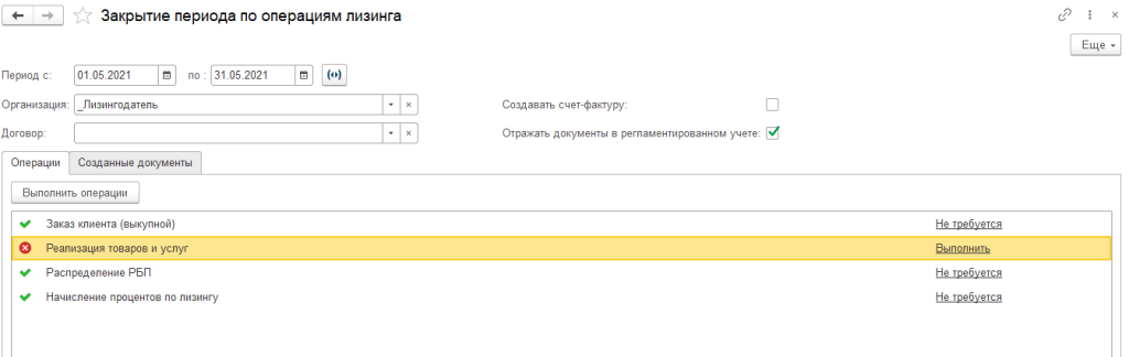 Для удобства отражения регулярных операций используется автоматизированное рабочее место «Закрытие периода по операциям лизинга». Данный функционал обеспечивает контрольные функции и позволяет автоматически формировать следующие документы: