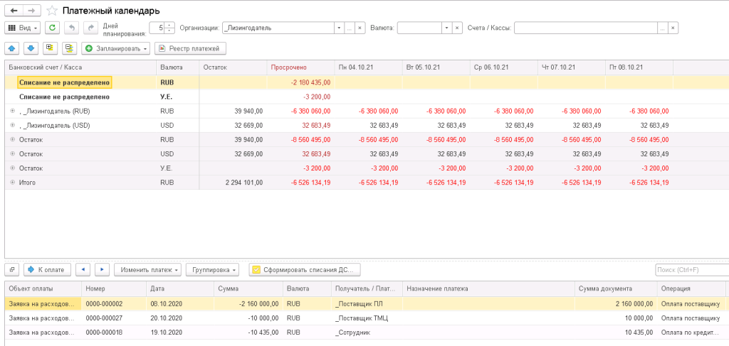 Казначейские операции обеспечивают учет и контроль поступления лизинговых платежей, формирование платежного календаря, ведение процесса расходования денежных средств по заявкам, а также формирование реестра платежей с учетом различных условий групповой обработки заявок на платежи по графикам платежей.