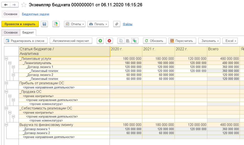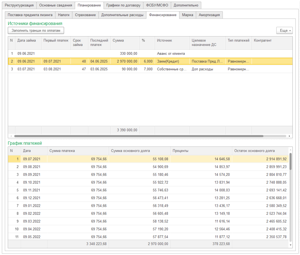 Возможности базового решения в части видов бюджетов, моделирования сценариев, формирования экземпляров бюджетов, план/фактного анализа в отраслевом решении «1С:Управление лизинговой компанией. Расширение для 1С:ERP» дополнены настройками для получения плановых платежей из действующих графиков платежей по лизинговым и кредитным договорам.