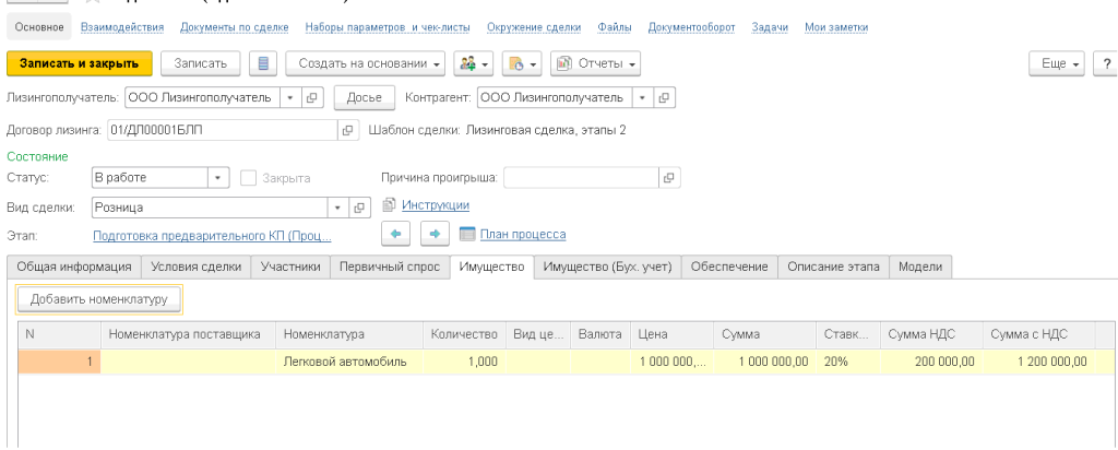 При управлении обслуживанием клиентов, автоматизации процессов планирования и контроля лизинговой сделки, а также при сопровождении договоров лизинга, обеспечении обратной связи с клиентами, работе по претензиям, регистрации и работе с обращениями и запросами используются возможности, заложенные в типовом решении. Функционал отраслевого решения дополняет карточки сделки новыми параметрами и условиями, характерными для лизинговой сделки.