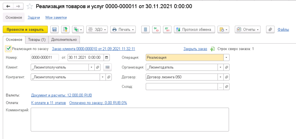 Документ «Реализация товаров и услуг» использует механизмы основного типового решения «1С:ERP Управление предприятием» и дополнен блоками автоматического создания «Заказов клиентов» на основании Лизинговой модели.
