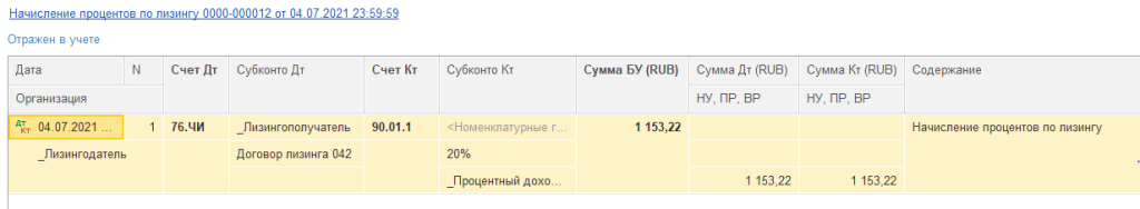 Начисление процентов по лизингу формирует бухгалтерские записи исключительно по бухгалтерскому учету, в размере доходов, рассчитанных в Лизинговой модели.