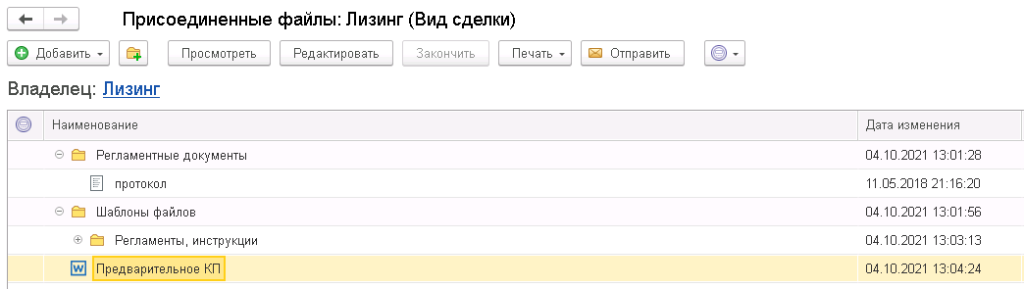 Встроенный документооборот обеспечивает хранение документов в разрезе сделки, клиента, партнера, единицы имущества, кредитного договора. Процесс обработки документов выполняется с применением типового механизма загрузки и обработки файлов в карточках документов, механизма согласования и утверждения документов. В решении обеспечивается создание шаблонов к типовым наборам первичных документов (файлов) в карточке лизинговой сделки.