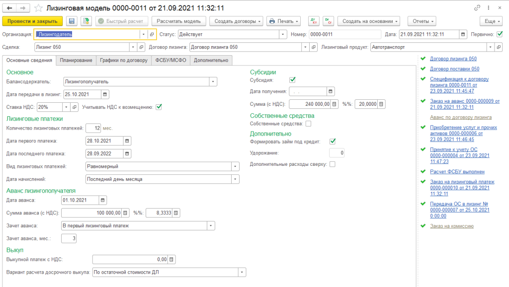 Моделирование и подготовка результатов сделки, создание индивидуальной модели расчетов по сделке выполняется с учетом основных (амортизация, поставка), параметров и графиков расчета лизинговых платежей) и дополнительных условий (финансирование, вознаграждение лизингодателя, дополнительные собственные услуги, услуги партнеров и др.) для конкретного клиента и договора лизинга.